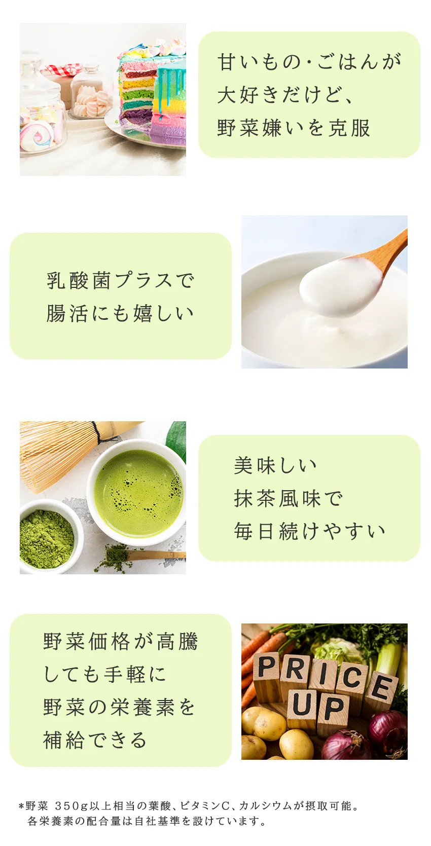 普段の食事の糖質はもちろん、甘いモノの糖質が気になる方にうれしい、350g相当の野菜の栄養素*1と桑葉と甘藷若葉のWパワーを1包で手軽に。