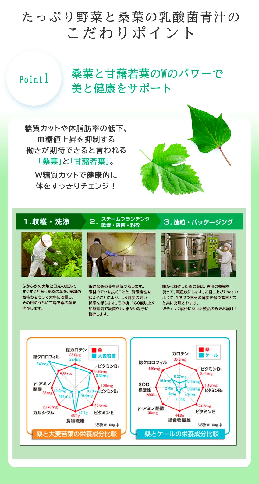 桑葉末(国内製造)、水溶性食物繊維、大麦若葉末、抹茶、甘藷若葉末、澱粉、殺菌乳酸菌末、茶抽出物、ニンジン末、ケール末、ブロッコリー末、ヨモギ末、アスパラガス末、オクラ末、コマツナ末、カボチャ末、ダイコン葉末、パセリ末、ホウレン草末/卵殻 Ca、硫酸 Mg、糊料(プルラン)、ビタミン C、ポリグルタミン酸(大豆由来)、 葉酸、ビタミン B2、ビタミン B6、ビタミン A、ビタミン D