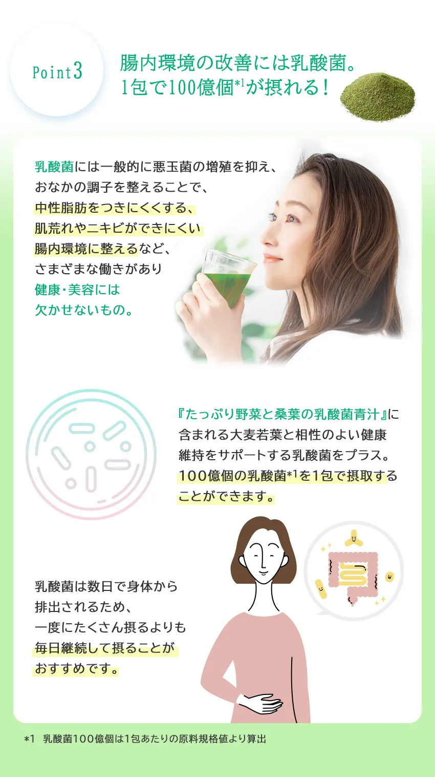 『たっぷり野菜と桑葉の乳酸菌青汁』に含まれる大麦若葉と相性のよい健康維持をサポートする乳酸菌をプラス。100億個の乳酸菌を1包で摂取することができます。