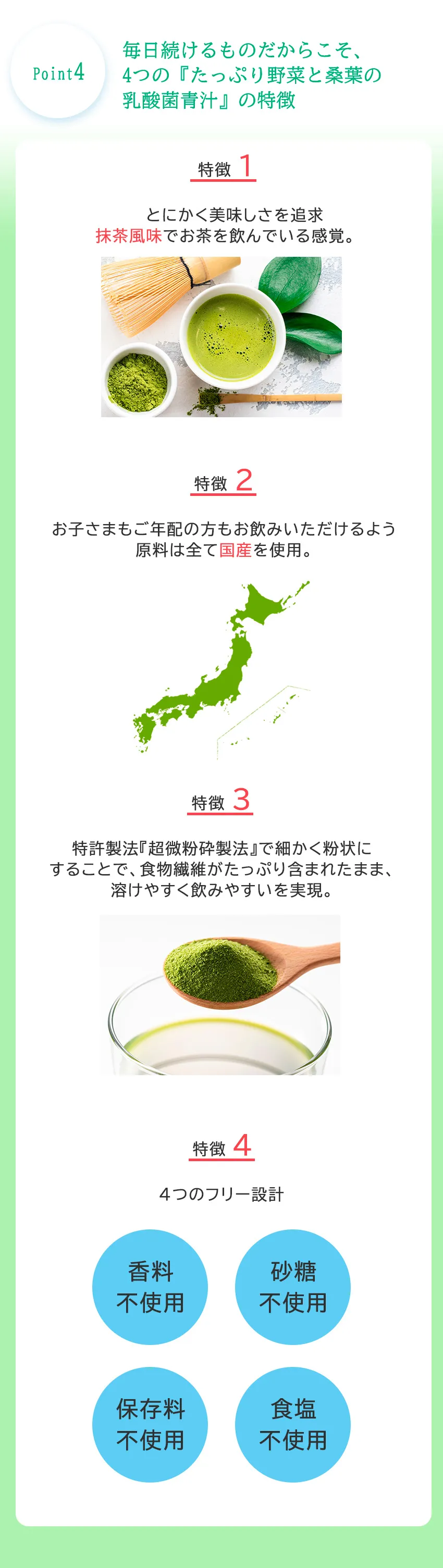 毎日続けるものだからこそ、4つの『たっぷり野菜と桑葉の乳酸菌青汁』の特徴