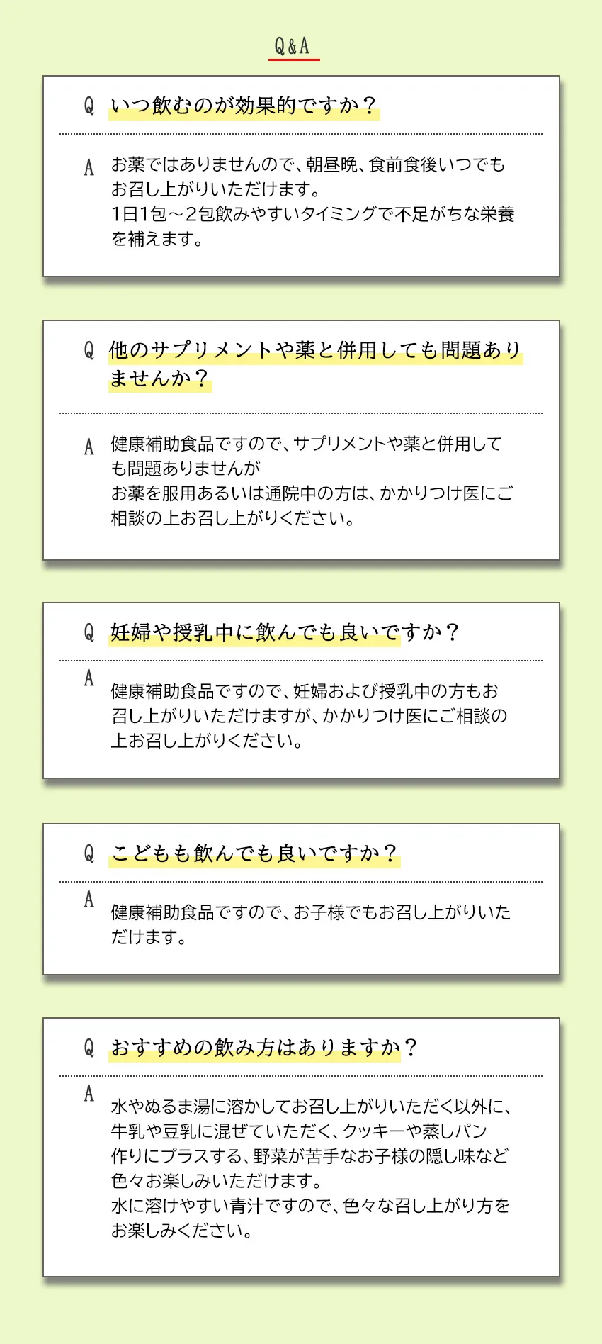A お薬ではありませんので、朝昼晩、食前食後いつでもお召し上がりいただけます。