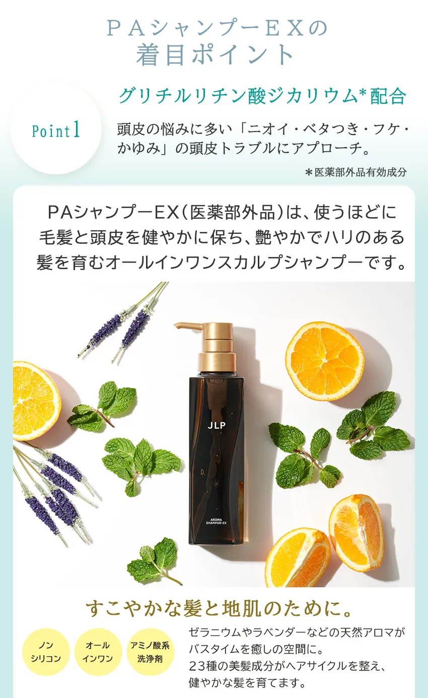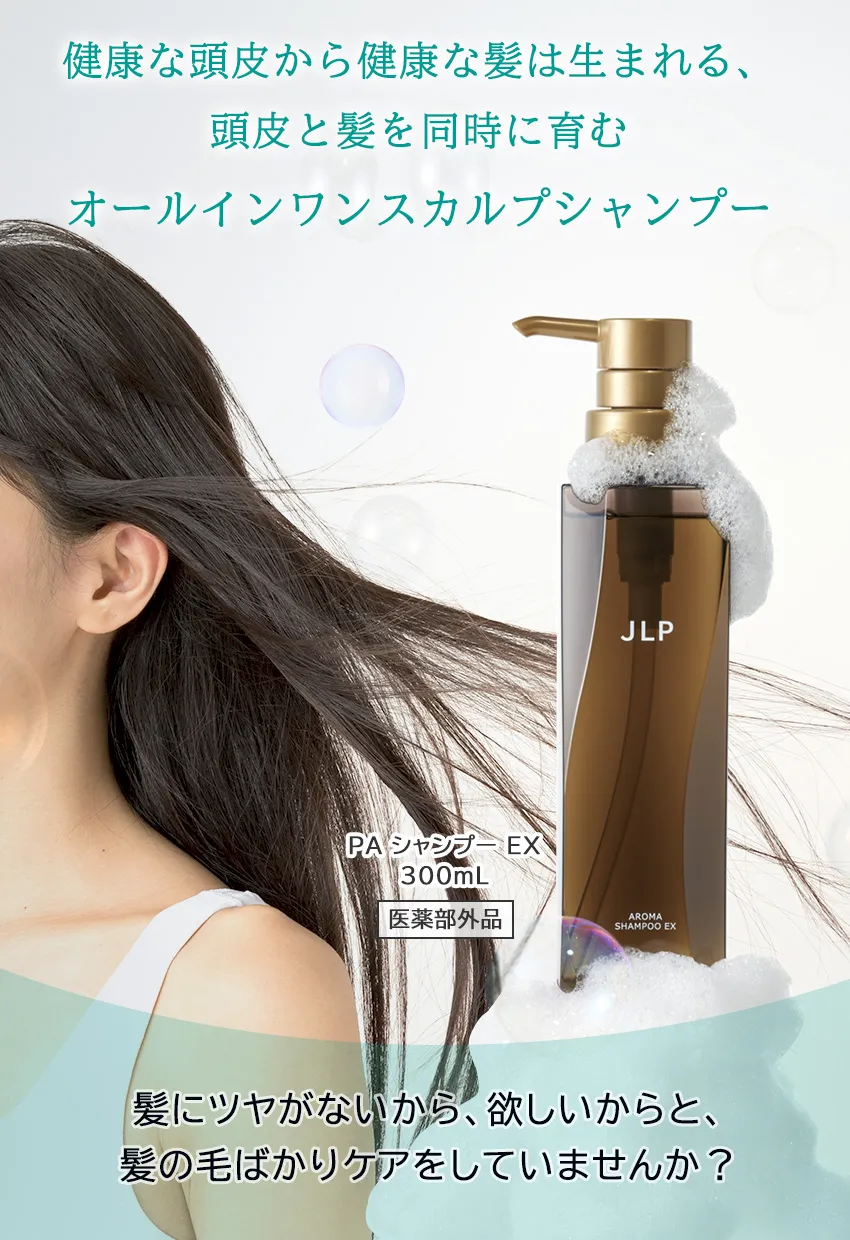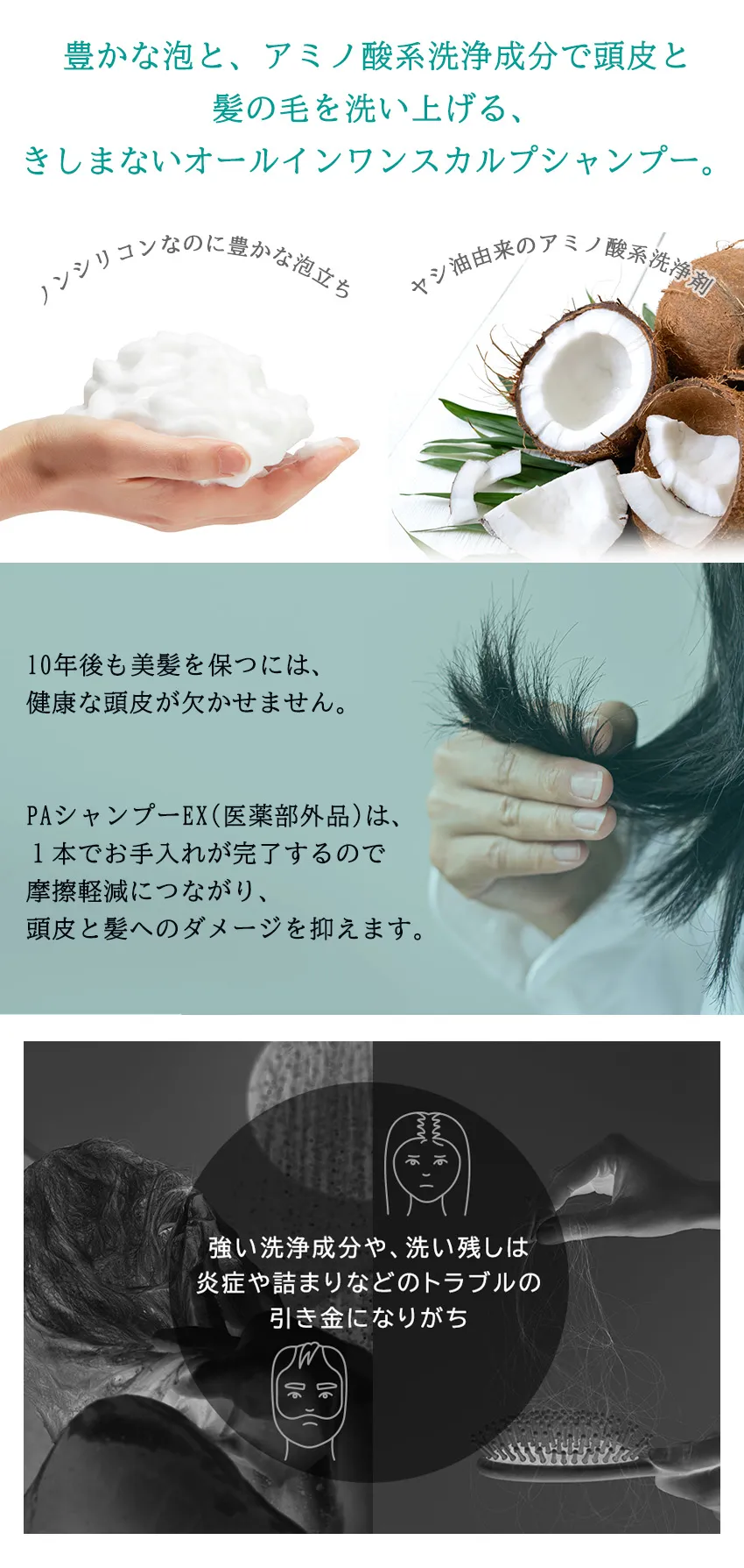 PAシャンプーEX(医薬部外品)は、使うほどに毛髪と頭皮を健やかに保ち、艶やかでハリのある髪を育むスカルプシャンプーです