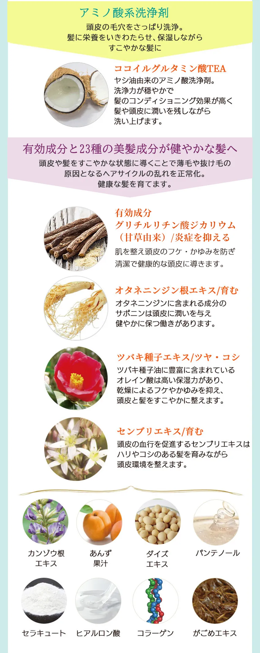 アミノ酸系洗浄成分で保湿しながら、23種類の美髪成分が頭皮と髪を健やかな状態へと導きます。