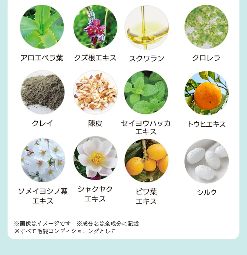 精製水、N-ヤシ油脂肪酸アシル-L-グルタミン酸トリエタノールアミン液、ヤシ油脂肪酸ジエタノールアミド、テトラデセンスルホン酸ナトリウム液、1,2-ペンタンジオール、1,3-プロパンジオール、ヤシ油脂肪酸アミドプロピルベタイン液、塩化O-[2-ヒドロキシ-3-(トリメチルアンモニオ)プロピル]ヒドロキシエチルセルロース、フェノキシエタノール、香料、水酸化カリウム、トウヒエキス、1,3-ブチレングリコール、ツバキエキス、N-[2-ヒドロキシ-3-[3-(ジヒドロキシメチルシリル)プロポキシ]プロピル]加水分解シルク、D-パントテニルアルコール、サクラ葉抽出液、シャクヤクエキス、セイヨウハッカエキス、チンピエキス、ヒアルロン酸ナトリウム(2)、ビワ葉エキス、海藻エキス(1)、含硫ケイ酸アルミニウム、スクワラン、アンズ果汁、濃グリセリン、ダイズエキス、クロレラエキス、アロエエキス(2)、センブリエキス、カンゾウフラボノイド、グリセリル-N-(2-メタクリロイルオキシエチル)カルバメート・メタクリル酸ステアリル共重合体、ニンジンエキス、加水分解コラーゲン末、カッコンエキス