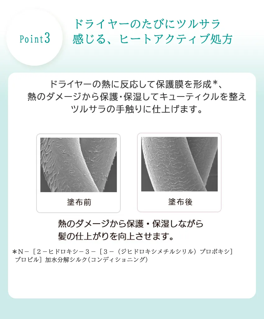ドライヤーの熱に反応して保護膜を形成*、熱のダメージから保護・保湿してキューティクルを整えツルサラの手触りに仕上げます。