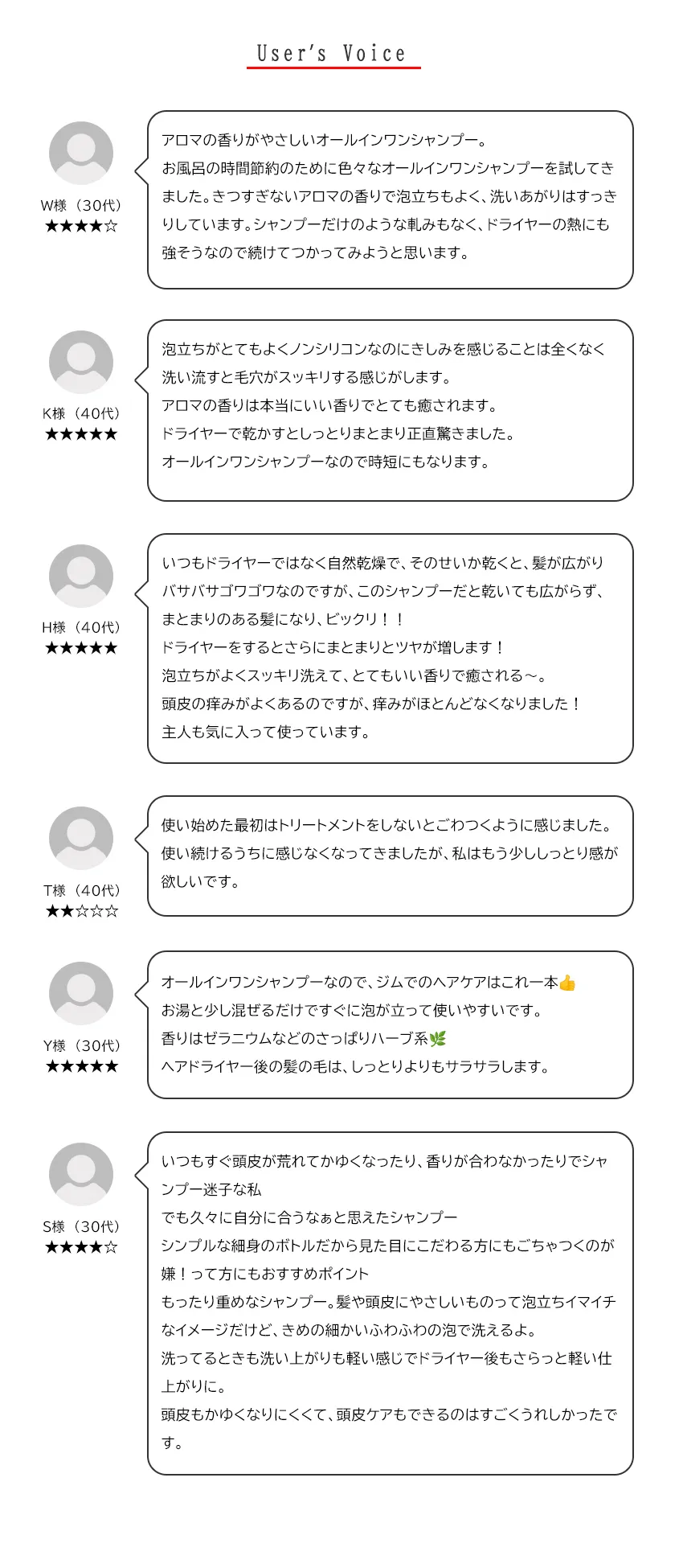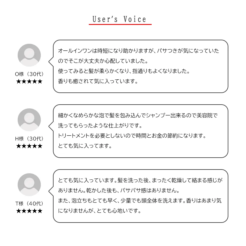 リンス・トリートメントが不要なため、摩擦によるダメージを極力抑え、トリートメントの流し残しなどによる肌荒れを防ぎます。