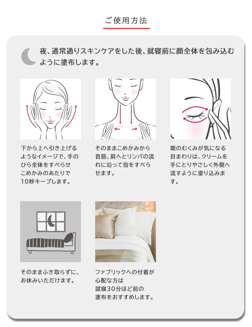 夜、通常通りスキンケアをした後、就寝前に顔全体を包み込むように塗布します。