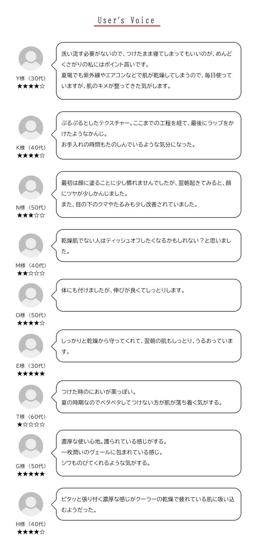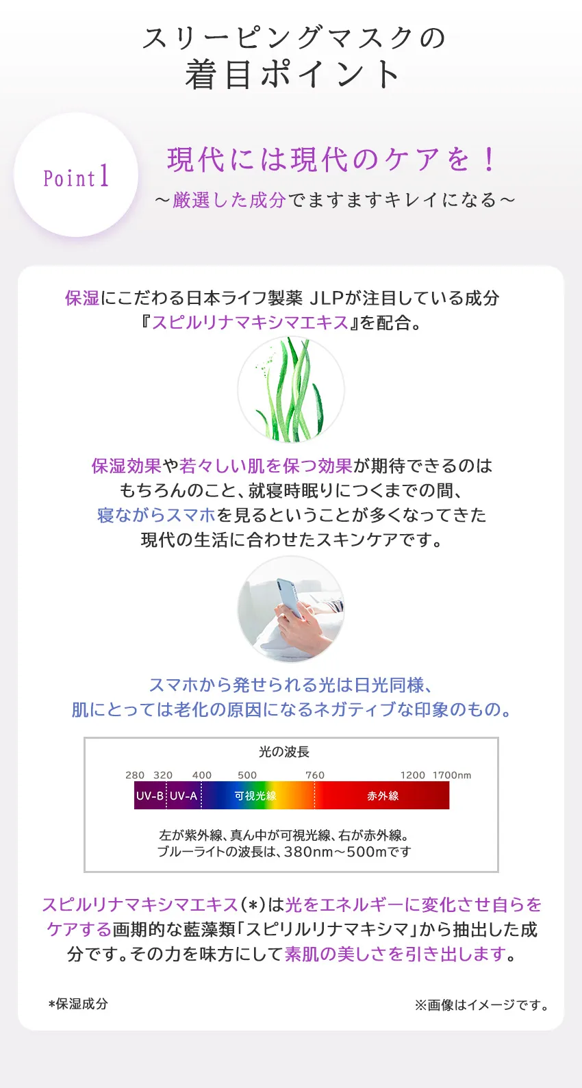 保湿効果や保湿効果や若々しい肌を保つ効果が期待できるのはもちろんのこと、就寝時眠りにつくまでの間、寝ながらスマホを見るということが多くなってきた現代の生活に合わせたスキンケアです。
