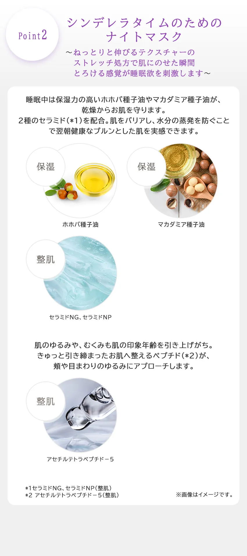 2種のセラミド*1を配合。肌をバリアし、水分の蒸発を防ぐことで翌朝健康なプルンとした肌を実感できます。