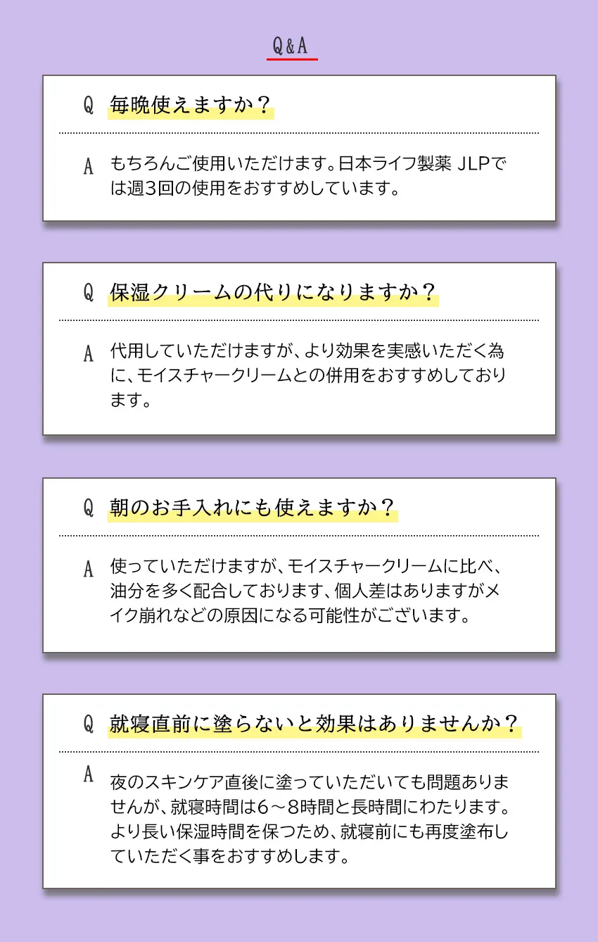 A夜のスキンケア直後に塗っていただいても問題ありませんが、就寝時間は6~8時間と長時間にわたります、より長い保湿時間を保つため、就寝前にも再度塗布していただく事をおすすめします。