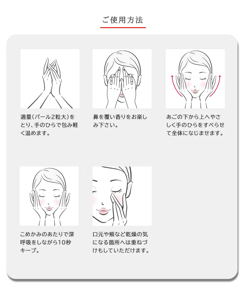 1.適量(パール2粒大)をとり、手のひらで包み軽く温めます。