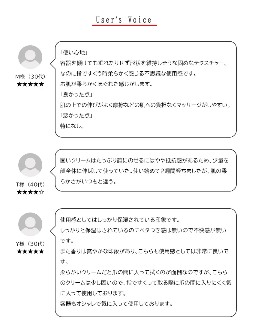 柔らかいクリームだと爪の間に入って拭くのが面倒なのですが、こちらのクリームは少し固いので、指ですくって取る際に爪の間に入りにくく気に入って使用しております。