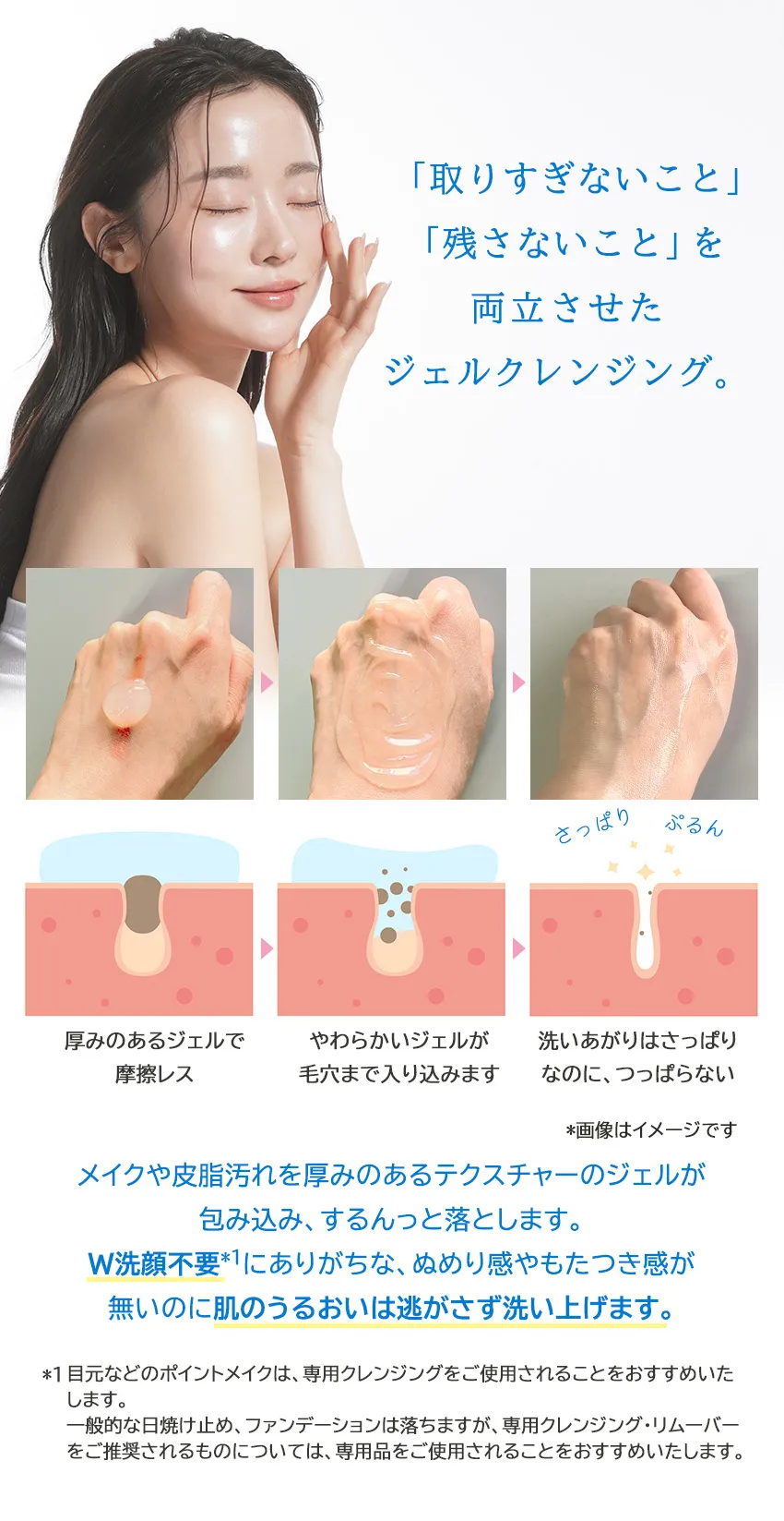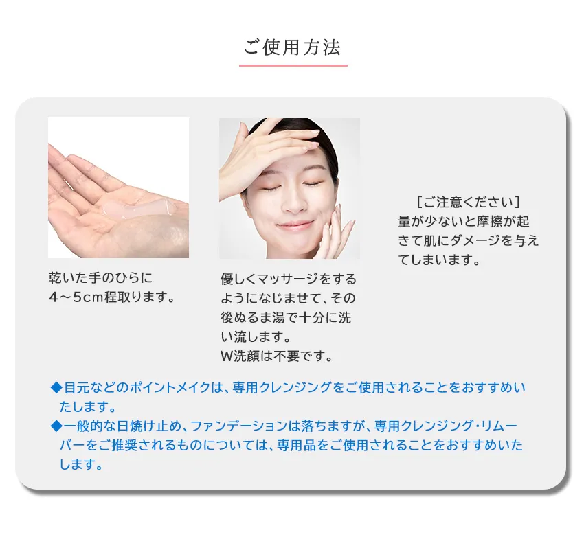 *1目元などのポイントメイクは、専用クレンジングをご使用されることをおすすめいたします。一般的な日焼け止め、ファンデーションは落ちますが、専用クレンジング・リムーバーをご推奨されるものについては、専用品をご使用されることをおすすめいたします。