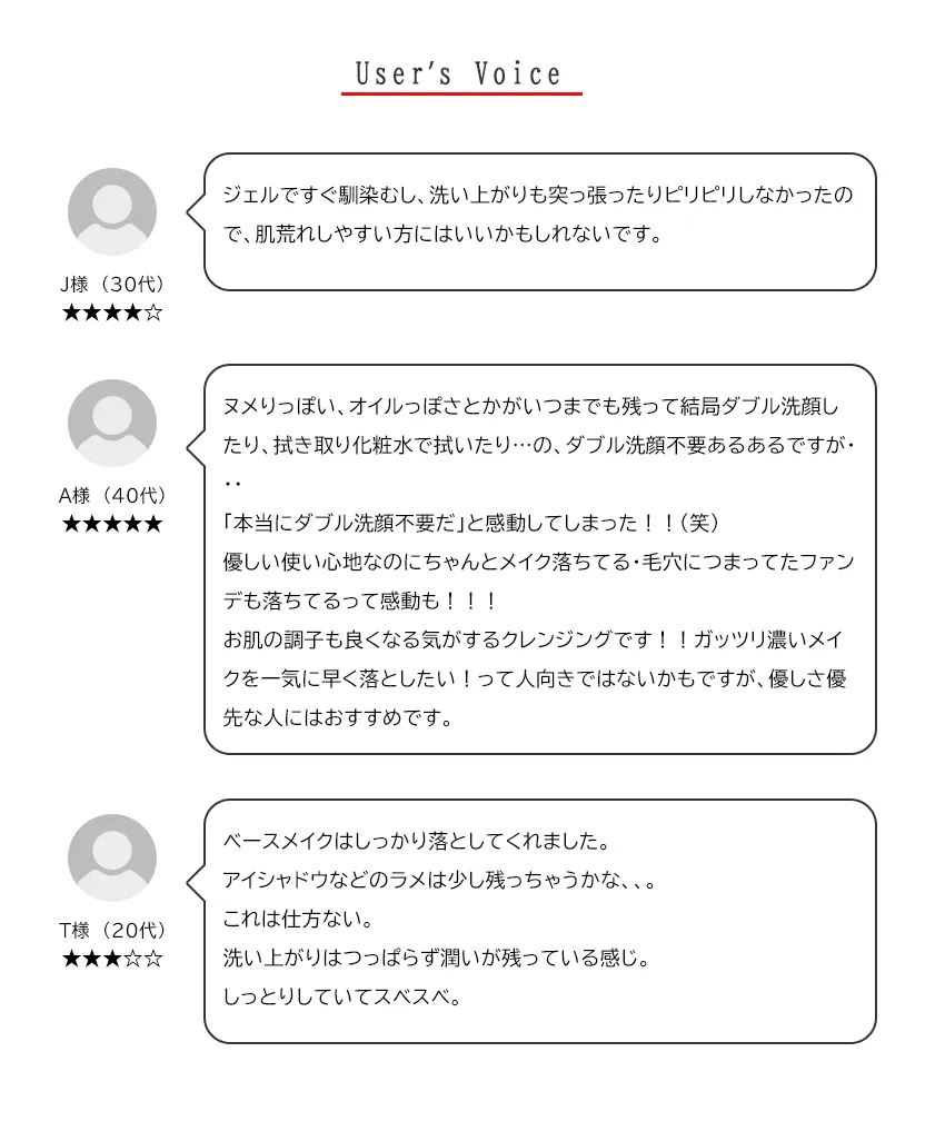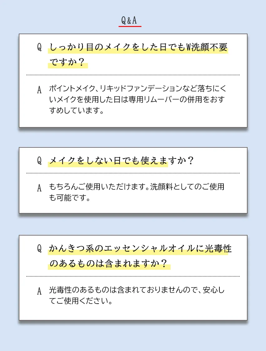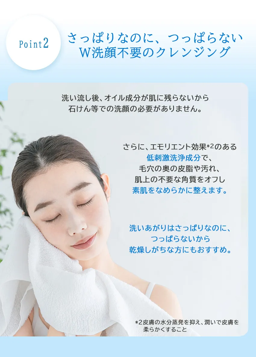 洗い流し後、オイル成分が肌に残らないから石けん等での洗顔の必要がありません。