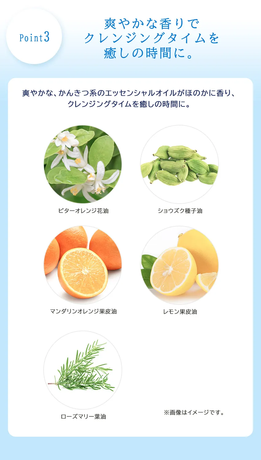 爽やかな、かんきつ系のエッセンシャルオイルがほのかに香り、クレンジングタイムを癒しの時間に。