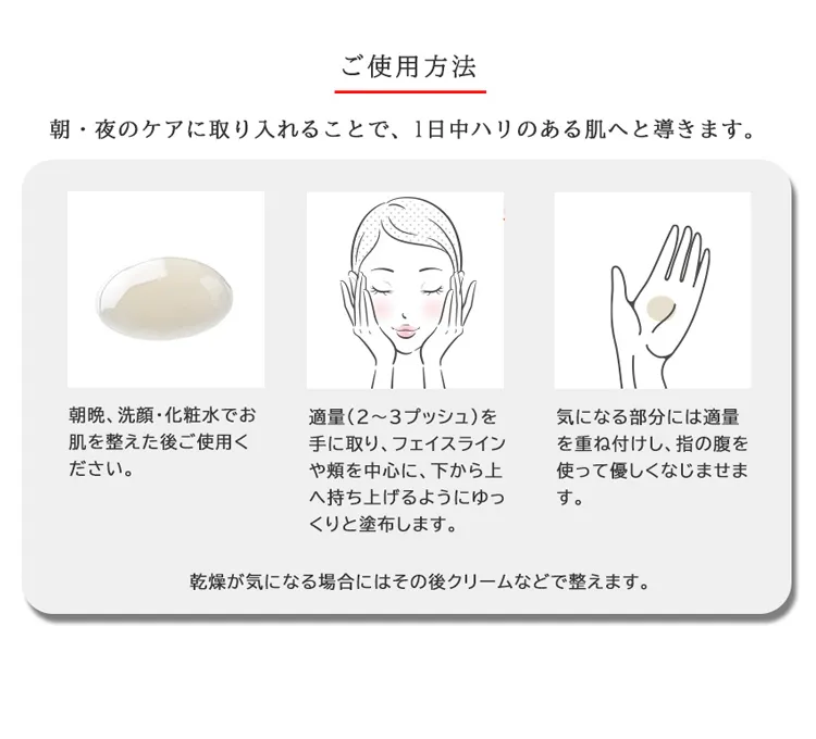 じっくりと繰り返し使い続ける事で、肌状態を整えながら若々しい印象の肌に導きます。