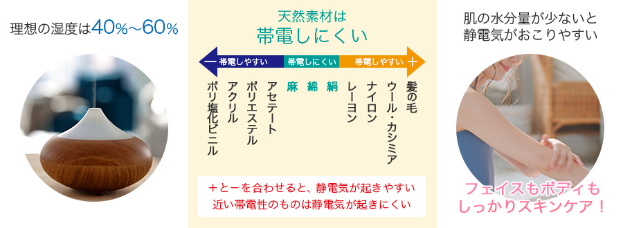 冬は空気が乾燥しやすく、肌や衣類に含まれる水分量も低下しがち。